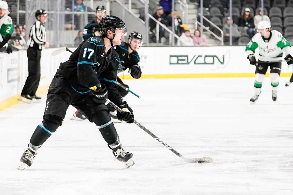 Photo courtesy of San Jose Barracuda. Thomas Bordeleau skates in to the Stars end.