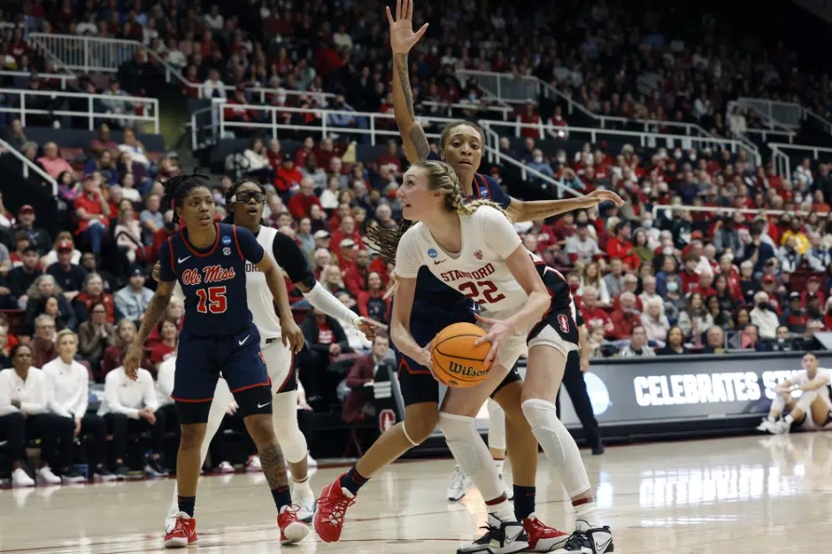 Stanford forward Cameron Brink (22) drives to the basket against Mississippi forward Madison Scott, right during the second half of a second-round at Maples Pavilion in Palo Alto on Sat Mar 19, 2023 (AP News photo)