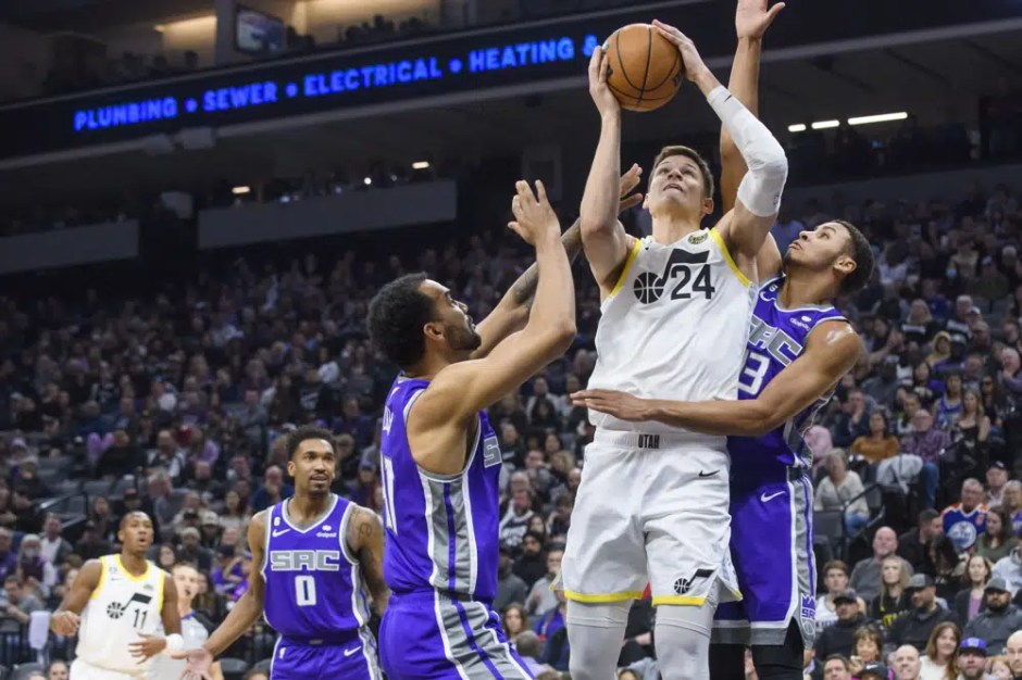 Utah Jazz center Walker Kessler (24) shoots from between Sacramento Kings forward Trey Lyles, left, and forward Keegan Murray during the first quarter at Golden 1 Center in Sacramento on Sat Mar 25, 2023 (AP News photo)