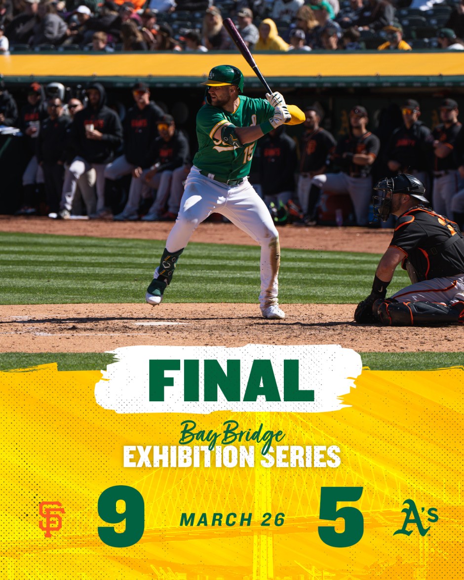 It wasn’t a festive Sunday afternoon for the A’s and their fans when they fell, 9-5 to the enigmatic Giants, who had come to play with a Cactus League record of 13-14 in the first of a two game, home and home exhibition series just before the season starts on Thursday, the 30th. Our two local teams had split the games they played earlier this month in Arizona.