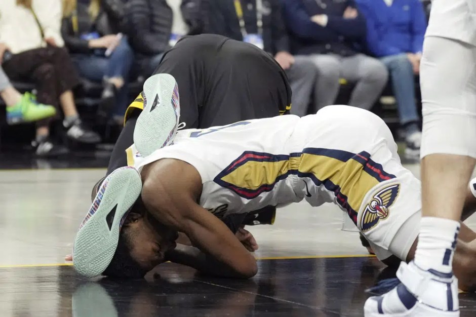 The feet of Golden State Warriors forward Draymond Green, top, land on the head of New Orleans Pelicans forward Herbert Jones, bottom, during the second quarter at Chase Center in San Francisco on Tue Mar 28, 2023 (AP News photo)