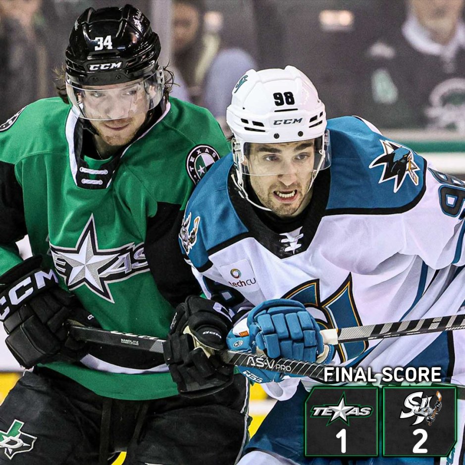 San Jose now trails the Tucson Roadrunners by six points for the seventh place and the final playoff spot in the Pacific Division with seven game remaining. Texas, with the loss, fell out of first place in the Central Division as the trail the Milwaukee Admirals by one point with 82 points.