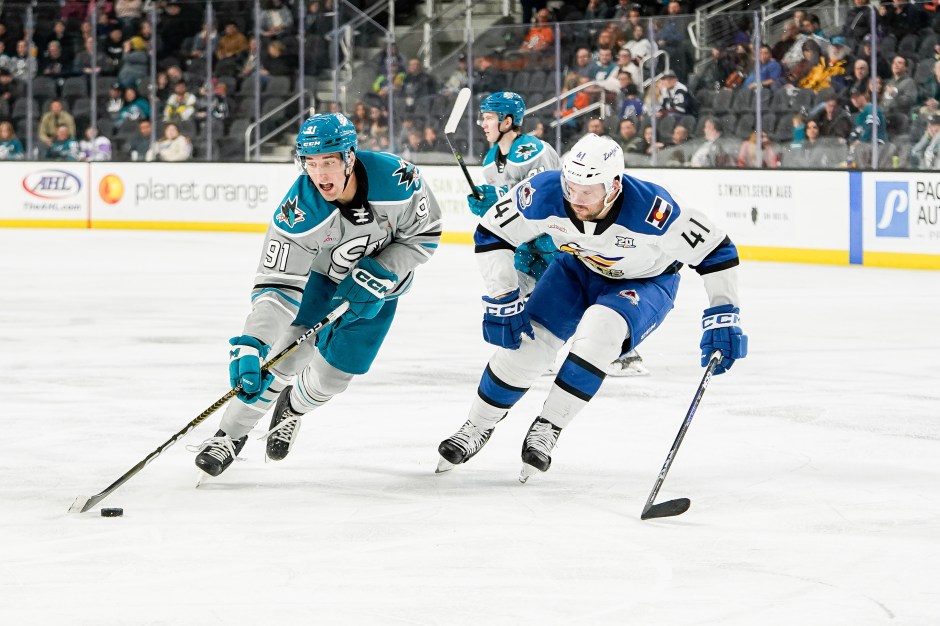 Photo courtesy of San Jose Barracuda. Anthony Vincent fights off a forechecker from Colorado.