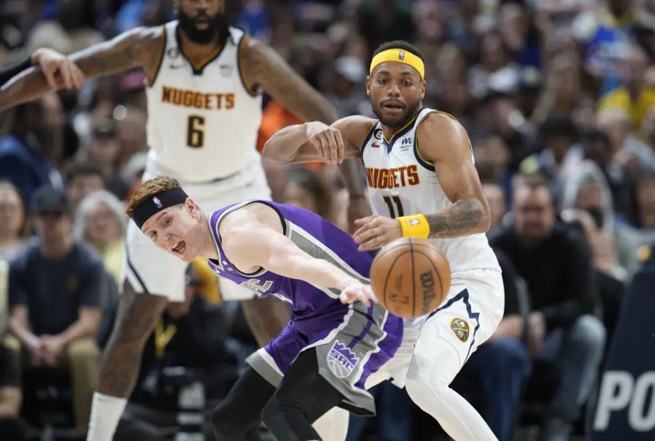Sacramento Kings guard Kevin Huerter, left, fights for control of a loose ball with Denver Nuggets forward Bruce Brown in the second half in Denver on Sun Apr 9, 2023 (AP News photo)