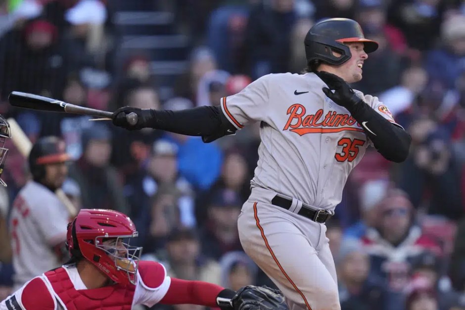 Baltimore Orioles catcher Andy Rutschman 25 year old who was the number one pick in the 2019 MLB draft and is off to an amazing start this season is seen here Mar 30, 2023 against the Boston Red Sox on opening day at Fenway Park in Boston (AP News)