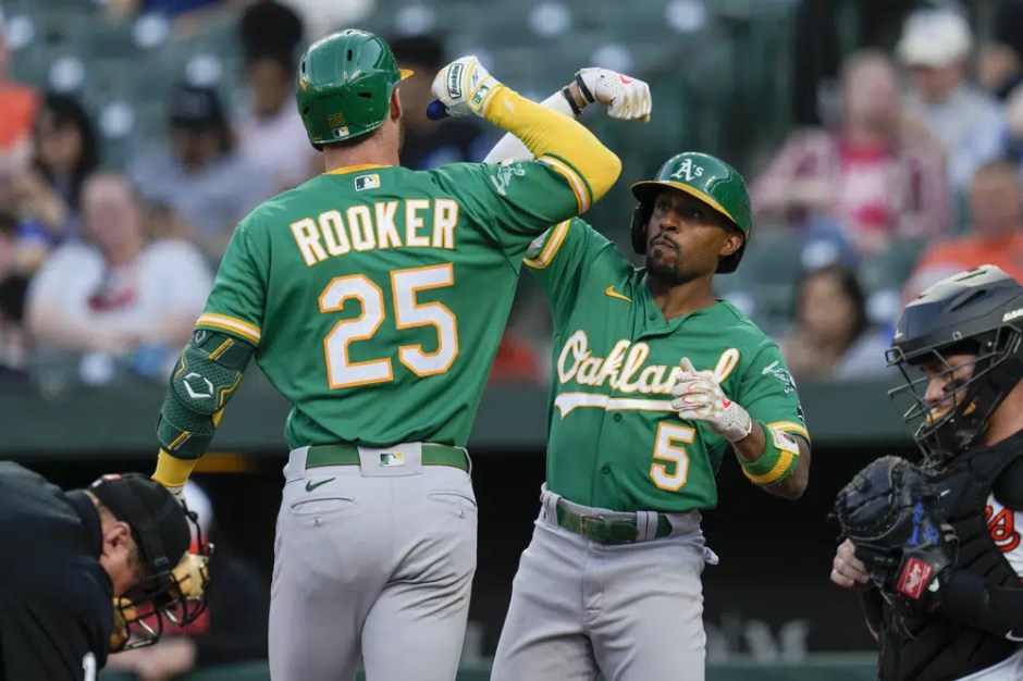 Oakland Athletics’ Brent Rooker (25) celebrates with Tony Kemp (5) after hitting a home run against the Baltimore Orioles at Camden Yards at Baltimore on Wed Apr 12, 2023 (AP News photo)