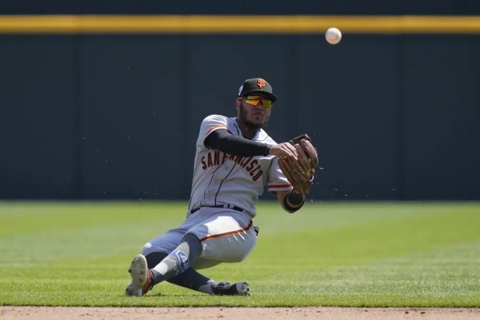 San Francisco Giants second baseman Thairo Estrada throws to first but is unable to get the out on Detroit Tigers’ Riley Greene during the fourth inning at Comerica Park in Detroit on Sat Apr 15, 2023 (AP News photo)