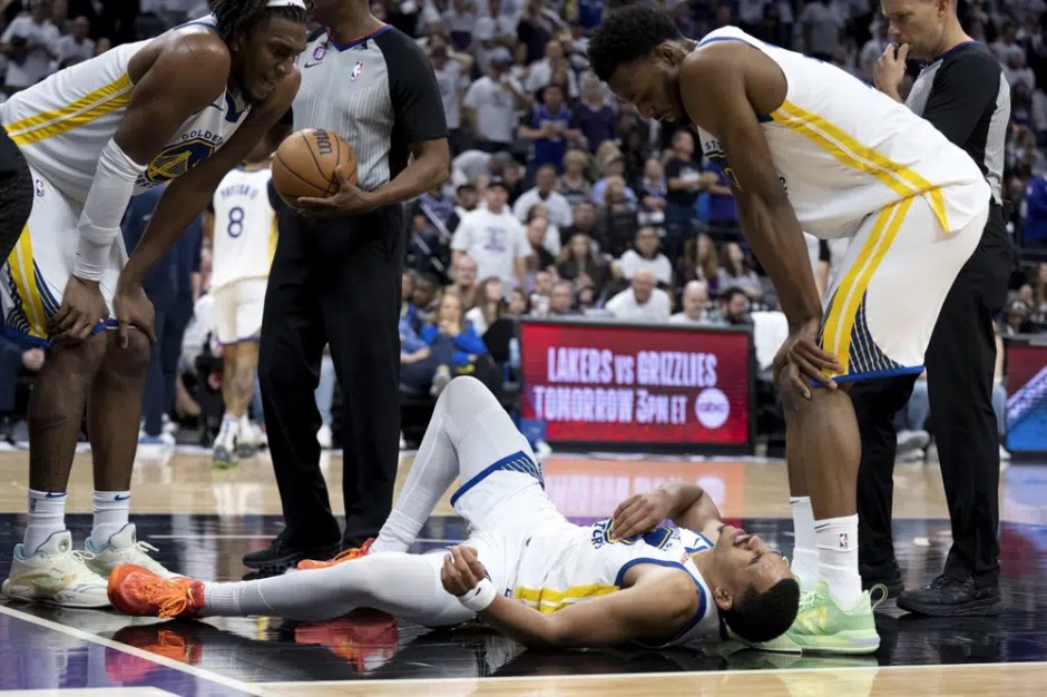 Golden State Warriors guard Jordan Poole, center, lies on the floor as teammates Kevon Looney, left, and Andrew Wiggins, right check on his condition after a hard fall against the Sacramento Kings in the third quarter at the Golden 1 in Sacramento on Sat Apr 15, 2023 (AP News photo)
