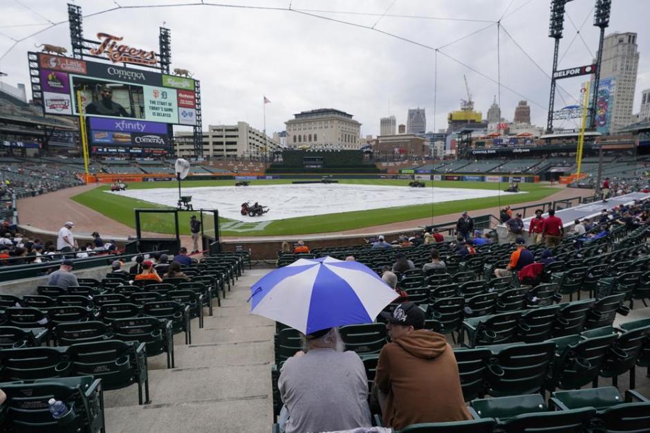 Detroit Tigers fans called it an evening after waiting in the pouring rain for five hours at Comerica Park in Detroit Sun Apr 16, 2023. The visiting San Francisco Giants packed up their equipment and headed to Miami for a series with the Marlins starting Mon Apr 17, 2023 (AP News photo)