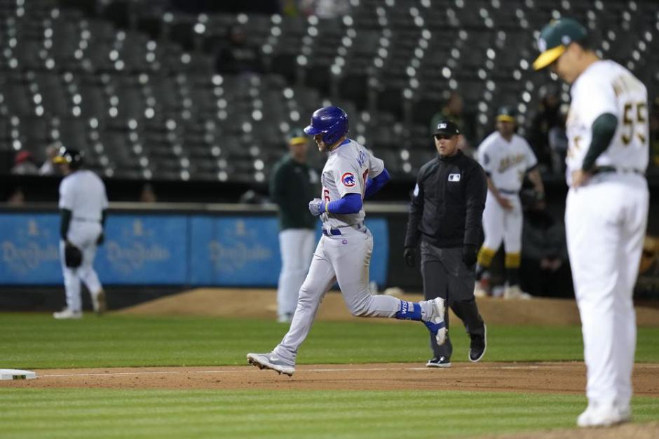 Chicago Cubs’ Patrick Wisdom, left, runs the bases after hitting a three-run home run against Oakland Athletics pitcher Adrian Martinez, foreground, during the eighth inning at the Oakland Coliseum on Mon Apr 17, 2023 (AP News photo)