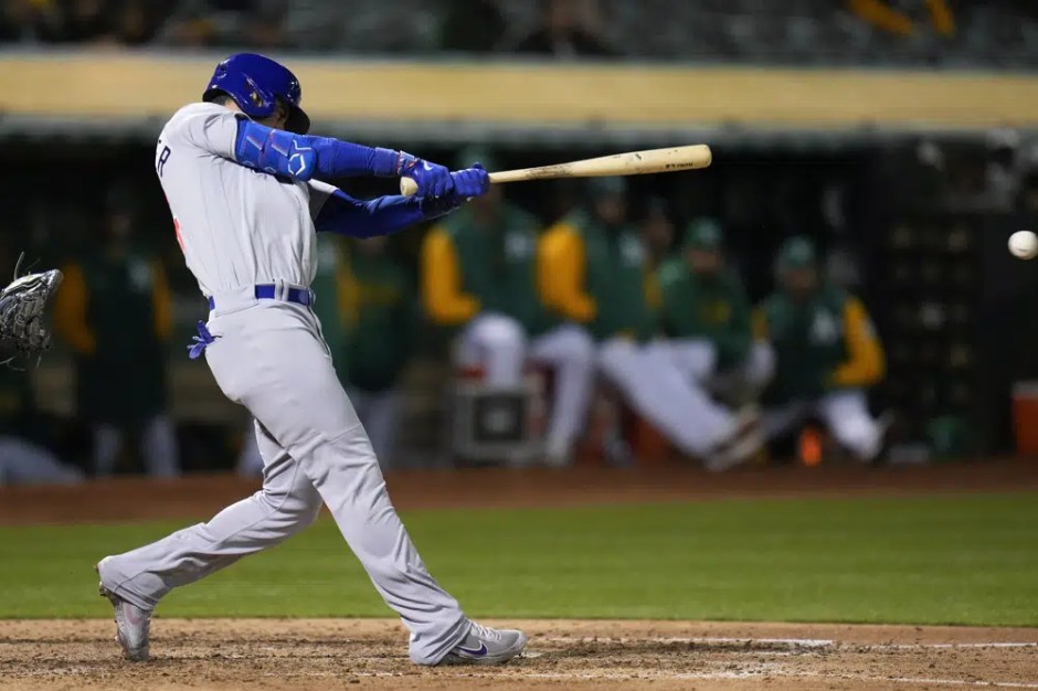 Chicago Cubs’ Cody Bellinger hits an RBI single against the Oakland Athletics during the eighth inning at the Oakland Coliseum on Tue Apr 18, 2023 (AP News photo)