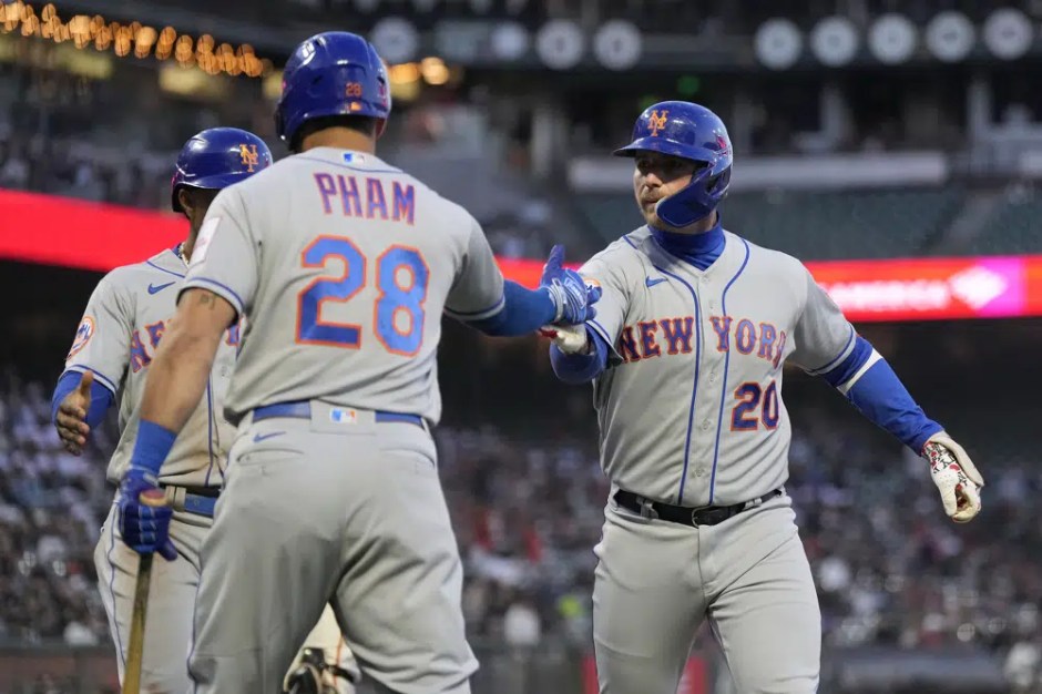 New York Mets’ Pete Alonso, right, is congratulated by Tommy Pham (28) after hitting a two-run home run against the San Francisco Giants during the fourth at Oracle Park in San Francisco on Thu Apr 20, 2023 (AP News photo)