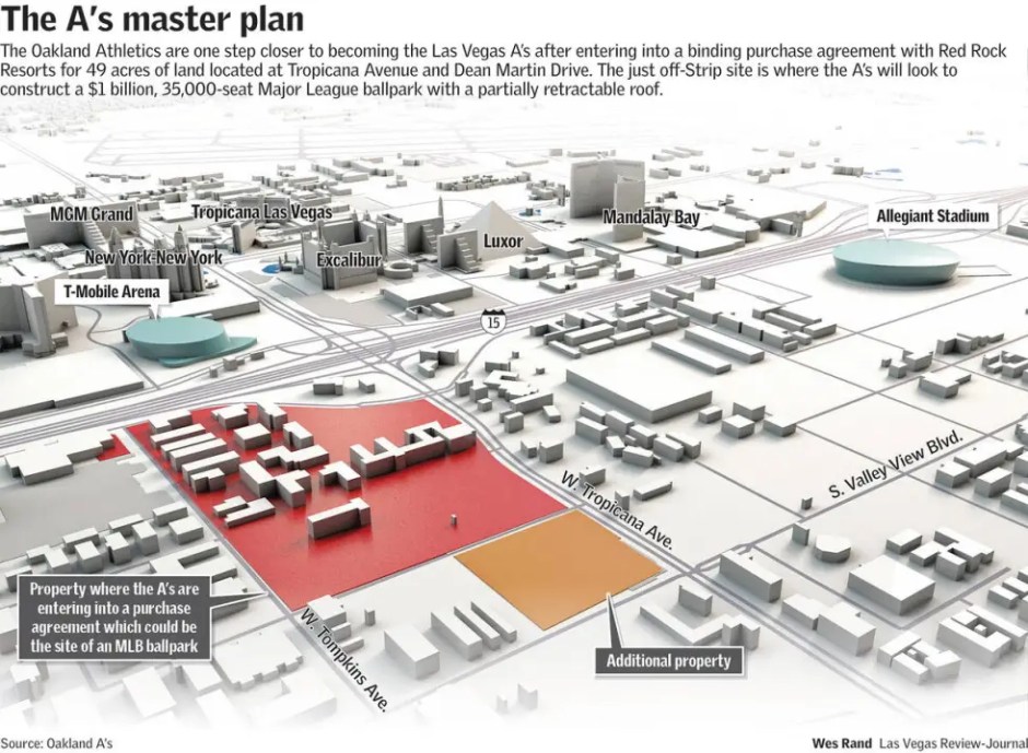 A map which outlines who and where businesses and where the Oakland A’s Tropicana ball park would be located on the Las Vegas Strip. The Oakland A’s have announced that they have a binding agreement with the state of Nevada to move to Vegas and their new ball park in 2027. (Las Vegas Review-Journal photo)