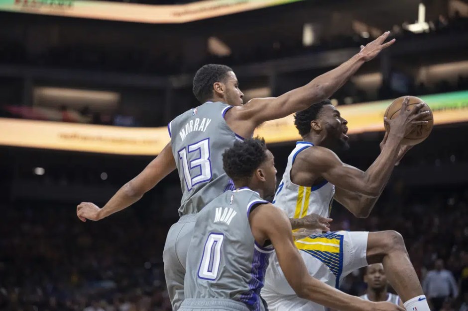 Golden State Warriors forward Andrew Wiggins scores past Sacramento Kings forward Keegan Murray (13) and guard Malik Monk (0) during the first half of Game 5 at Golden One Center in Sacramento on Wed Apr 26, 2023 (AP News photo)