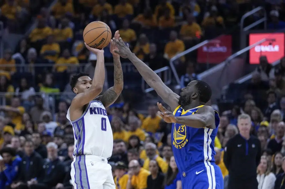 Sacramento Kings guard Malik Monk, left, looks to shoot over Golden State Warriors forward Draymond Green during the first half of Game 6 at Chase Center in San Francisco on Fri Apr 28, 2023 (AP News photo)