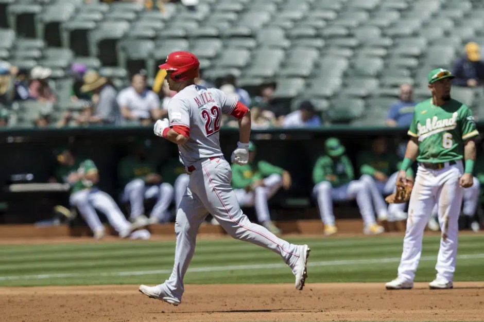 Cincinnati Reds’ Luke Maile runs the bases after hitting a solo home run against the Oakland Athletics during the third inning at the Oakland Coliseum on Sat Apr 29, 2023 (AP News photo)
