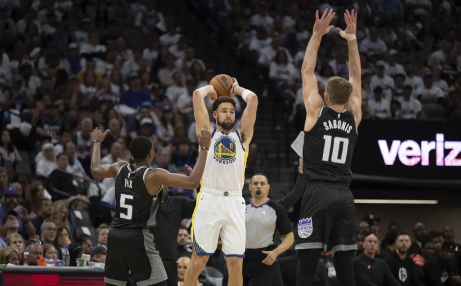 Sacramento Kings guard De’Aaron Fox (5) and forward Domantas Sabonis (10) defend against Golden State Warriors guard Klay Thompson (11) who looks to pass during the second half of Game 7 of the first round of the NBA playoffs at Golden 1 Center in Sacramento (AP News photo)