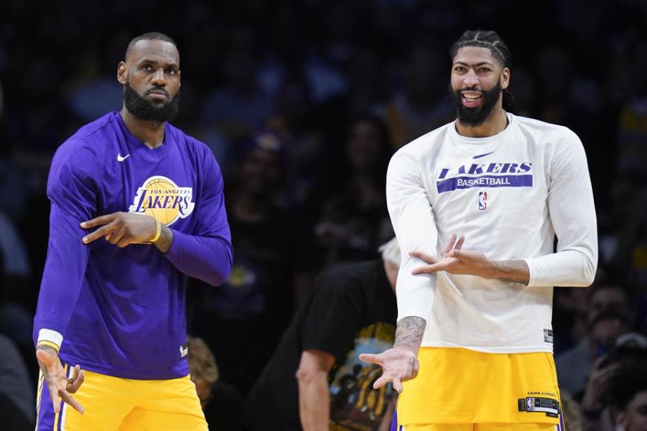 Los Angeles Lakers’ LeBron James, left, and Anthony Davis react to a 3-point basket against the Memphis Grizzlies by a teammate during the second half in Game 6 of first-round NBA basketball playoff series Friday, April 28, 2023, in Los Angeles. (AP News photo)
