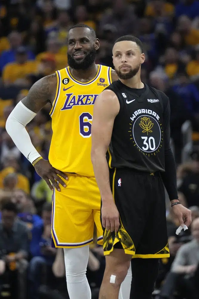 Los Angeles Lakers LeBron James (6) stands behind the Golden State Warriors (30) Stephen Curry during game 1 at Chase Center in San Francisco on Tue May 2, 2023 (AP News photo)