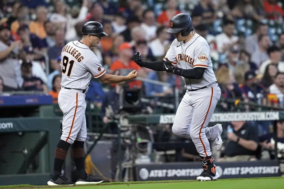 San Francisco Giants’ Wilmer Flores, right, celebrates with third base coach Mark Hallberg (91) after hitting a home run against the Houston Astros during the ninth inning at Minute Maid Field in Houston on Wed May 3, 2023 (AP News photo)