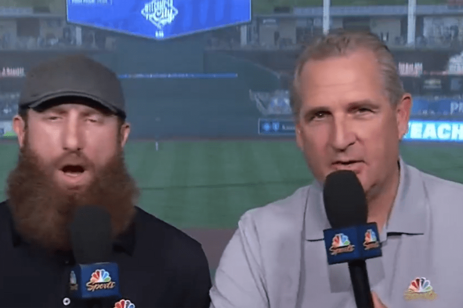 Oakland A’s NBC Sports Bay Area broadcasters Dallas Braden (left) and Glen Kuiper (right) in the pre game segment where Kuiper used the N word in reference to the Negro League Baseball Museum in Kansas City where they had visited before the Oakland A’s at Kansas City Royals game on Fri May 5, 2023 (NBC Sports Bay Area screen grab)