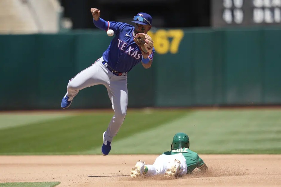 Photo courtesy of AP Photo/Jeff Chiu. Esteury Ruiz steals second base as Marcus Semien catches the ball.