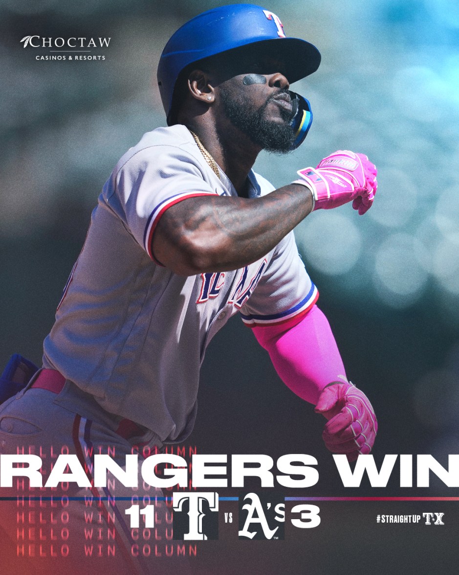 The Texas Rangers made a laugher out of game 4 of the four game series at the Oakland Coliseum on Sun May 14, 2023 (@Rangers photo)