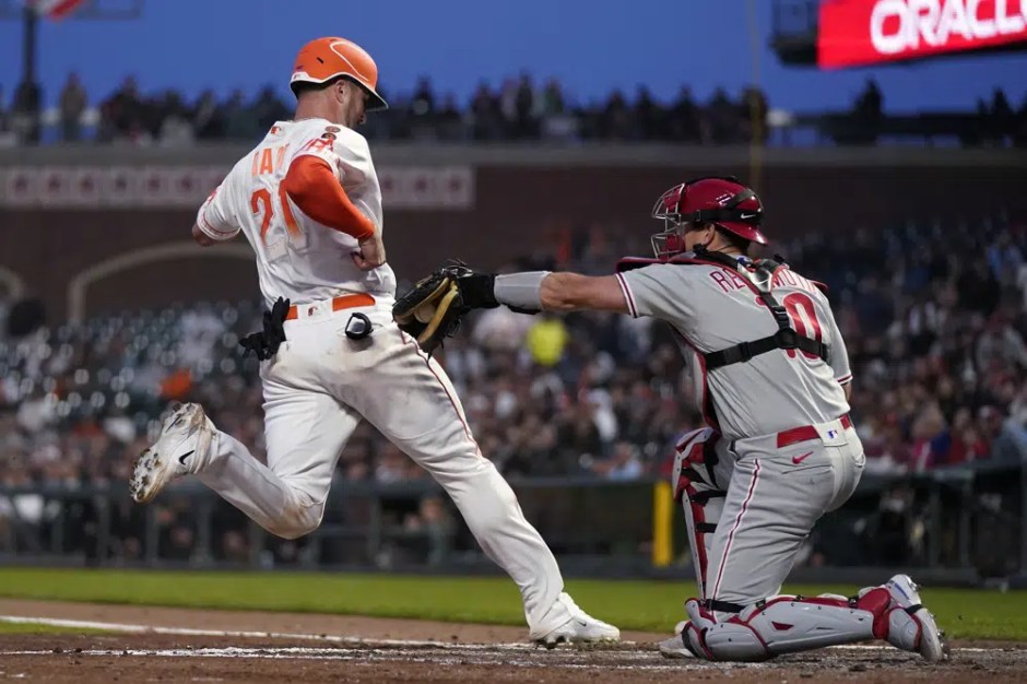 San Francisco Giants’ Joey Bart, left, scores against Philadelphia Phillies catcher J.T. Realmuto during the fourth inning at Oracle Park in San Francisco on Tue May 16, 2023 (AP News photo)
