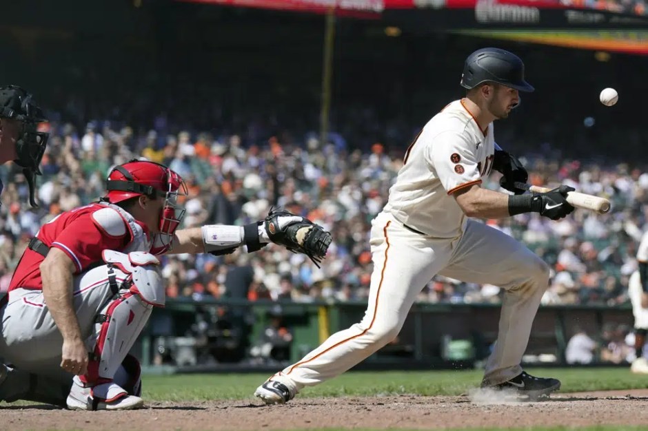 San Francisco Giants’ Joey Bart, right, bunts for a single in front of Philadelphia Phillies catcher J.T. Realmuto during the eighth inning at Oracle Park in San Francisco on Wed May 17, 2023 (AP News photo)