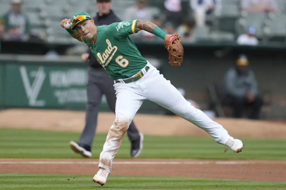 Oakland Athletics third baseman Jace Peterson (6) throws to first base on a single hit by Houston Astros’ Yainer Diaz during the fourth inning at the Oakland Coliseum on Sun May 28, 2023 (AP News photo)