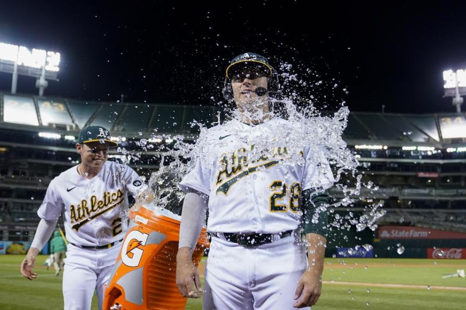 Oakland Athletics’ Nick Allen, left, douses Jonah Bride with iced water after the team’s 2-1 victory over the Atlanta Braves in a baseball game in Oakland, Calif., Tuesday, May 30, 2023. (AP News photo)