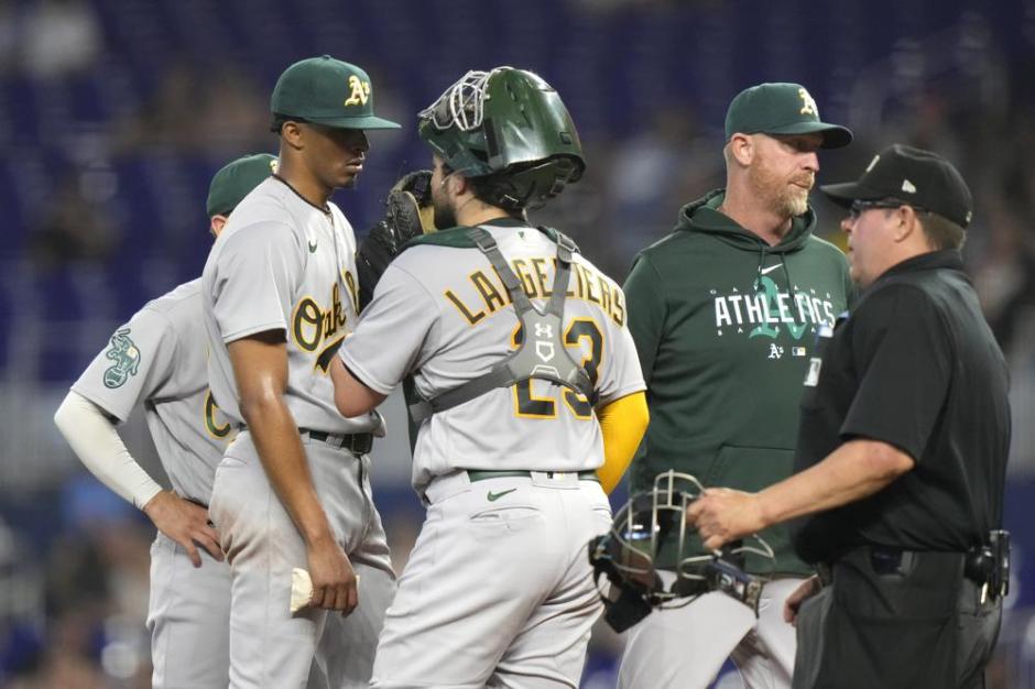 Oakland Athletics starting pitcher Luis Medina, front left, talks with catcher Shea Langeliers (23) during the first inning at LoanDepot Park in Miami on Sat Jun 3, 2023 (AP News photo)