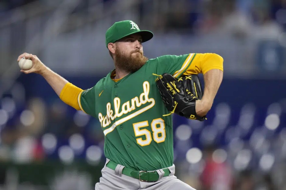 Oakland A’s starter Paul Blackburn pitches against the Miami Marlins at LoanDepot Park in Miami on Sun Jun 4, 2023 (AP News photo)