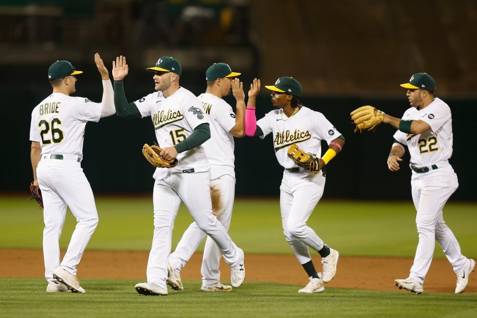 Photo courtesy of Oakland Athletics. The A’s celebrate a victory over the Rays on 7/13/23.