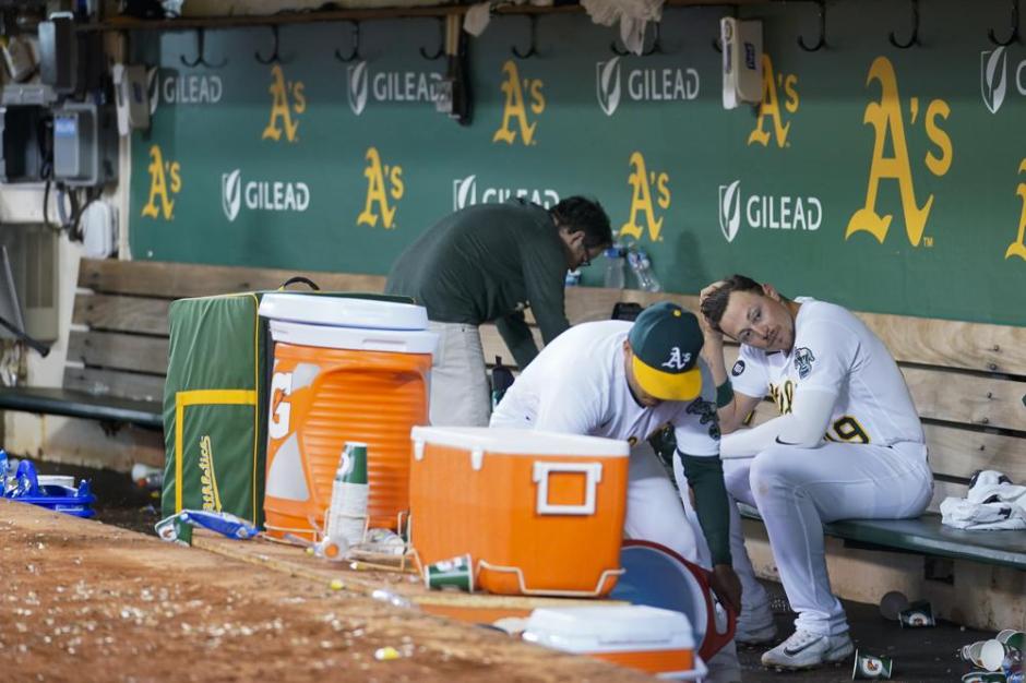 Oakland Athletics’ Ryan Noda, right, sits in the dugout after the team’s 6-1 loss to the Philadelphia Phillies at the Oakland Coliseum on Fri Jun 16, 2023 (AP News photo)