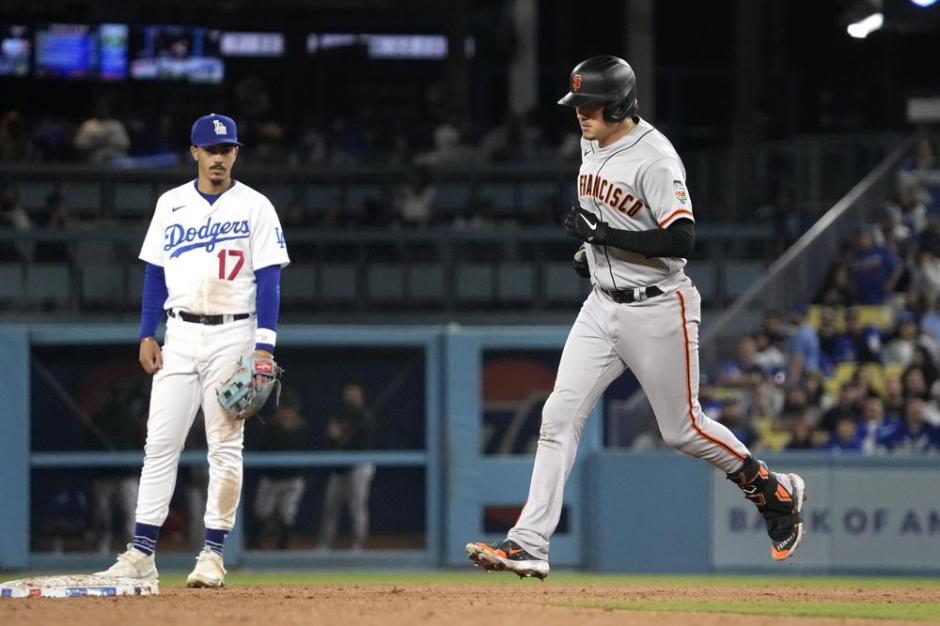 San Francisco Giants’ Wilmer Flores, right, rounds second after hitting a two-run home run as Los Angeles Dodgers second baseman Miguel Vargas watches during the seventh inning at Dodger Stadium in Los Angeles on Fri Jun 16, 2023 (AP News photo)
