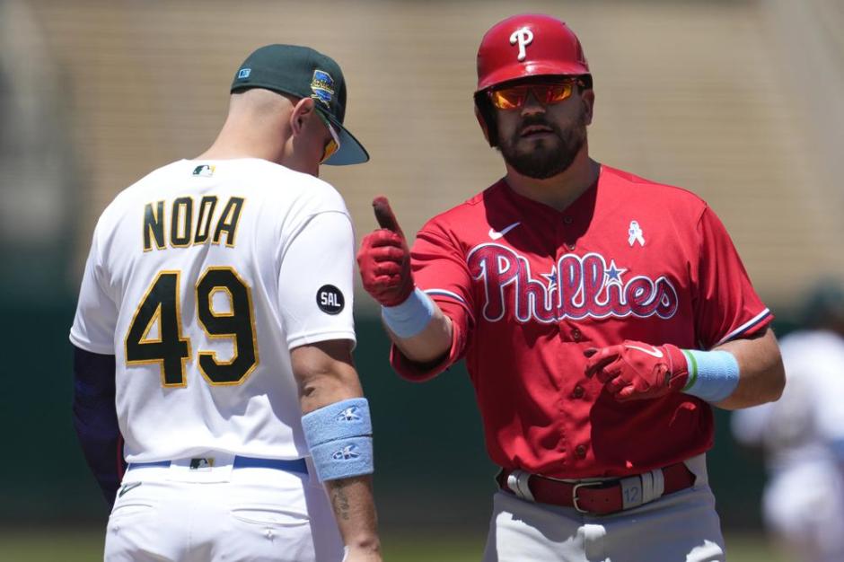Philadelphia Phillies’ Kyle Schwarber, right, gestures toward teammates after hitting a single next to Oakland Athletics first baseman Ryan Noda (49) during the third inning at the Oakland Coliseum on Sun Jun 18, 2023 (AP News photo)