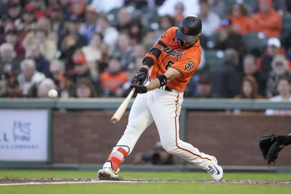 San Francisco Giants’ Michael Conforto hits a two-run double against the Arizona Diamondbacks during the third inning at Oracle Park in San Francisco on Fri Jun 23, 2023 (AP News photo)