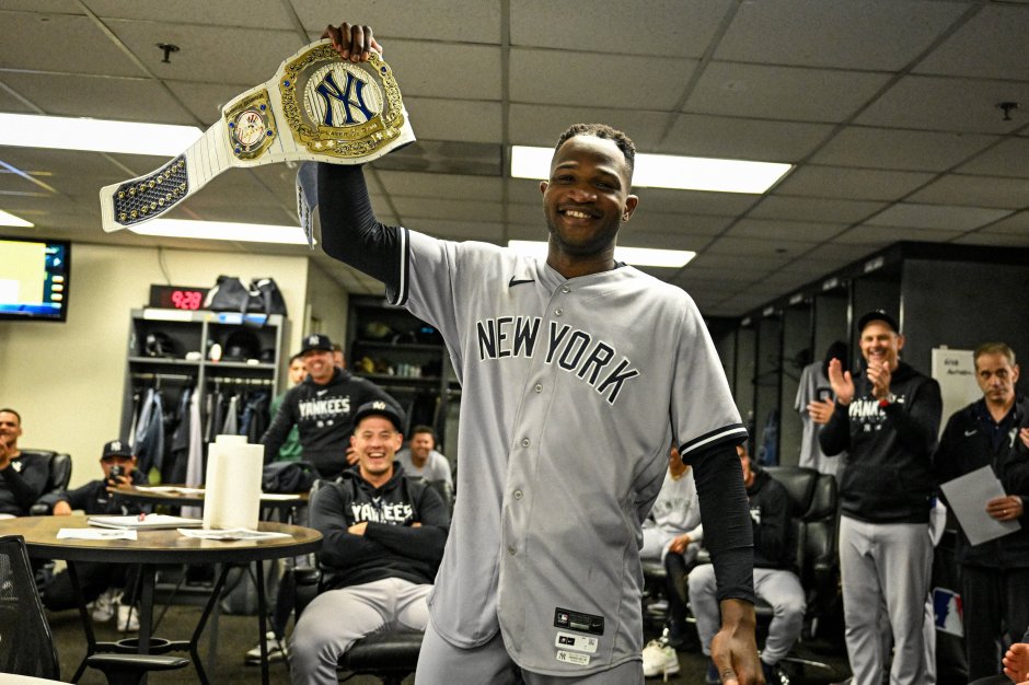 New York Yankees pitcher Herman Domingo holds up the winner’s belt after throwing a perfect game no hitter at the Oakland Coliseum against the Oakland A’s on Wed Jun 28, 2023 (@Yankees photo)