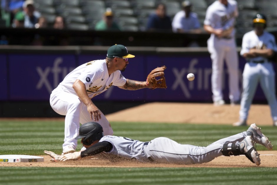 The Chicago White Sox Zach Remillard slides into third base under the glove of Oakland A’s third baseman Jace Pederson in the top of the sixth inning at the Oakland Coliseum on Sun Jul 2, 2023 (AP News photo)