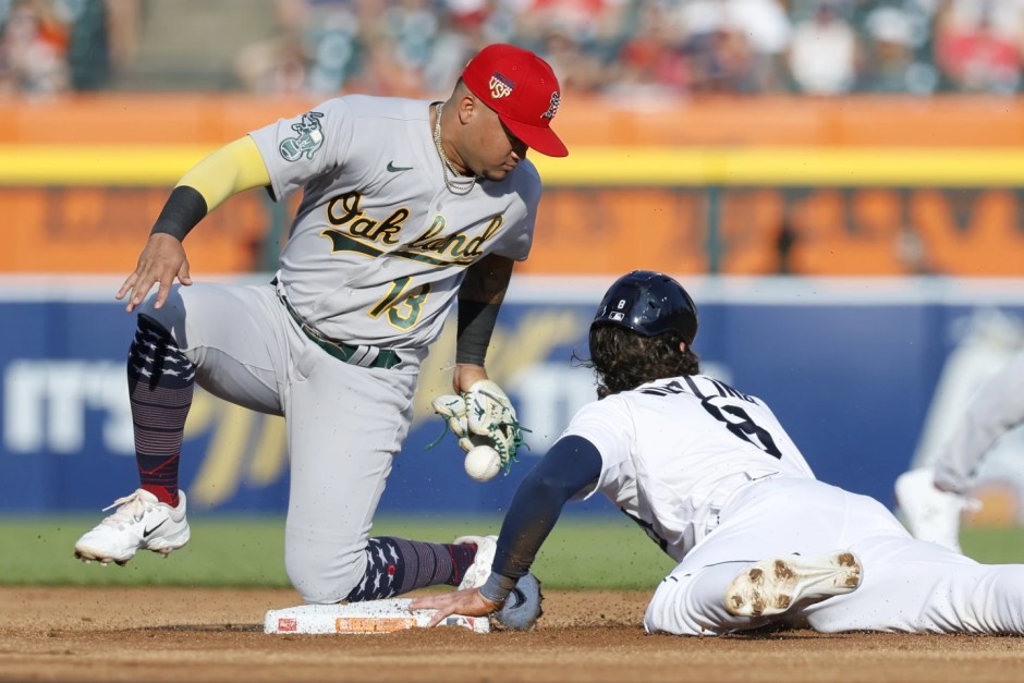 The Detroit Tigers Vierling slides in safely with the steal (right) as the A’s second baseman Jordan Diaz (13) gets the drop on the ball in the bottom of the first inning at Comerica Park in Detroit on Tue Jul 4, 2023 (AP News photo)