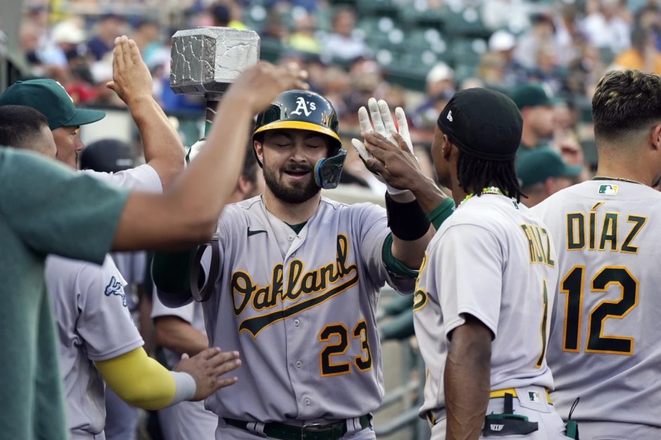 Oakland A’s Shea Langeliers knows it’s hammer time after crushing a solo shot in the top of the fourth inning at Comerica Park against the Detroit Tigers on Wed Jul 5, 2023 (AP News photo)