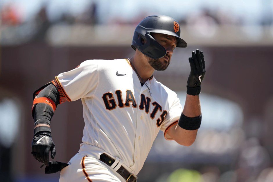 San Francisco Giants Michael Conforto runs the bases after slugging a two run home run off Colorado Rockies pitcher Connor Seabold in the bottom of the first inning at Oracle Park in San Francisco on Sun Jul 9, 2023 (AP News photo)