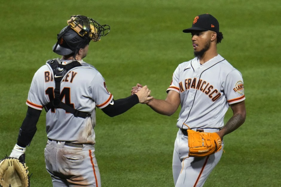 San Francisco Giants catcher Patrick Bailey (left) congratulates Giants closer Camilo Doval (right) at the conclusion of the bottom of the ninth inning at PNC Pittsburgh on Fri Jul 14, 2023 (AP News photo)