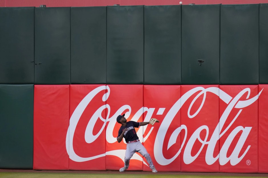 Minnesota Twins centerfielder Michael A Taylor watches the ball take a bounce off the centerfield fence for a double for Oakland A’s Zack Gelof in the bottom of the third inning at the Oakland Coliseum on Fri Jul 14, 2023 (AP News photo)