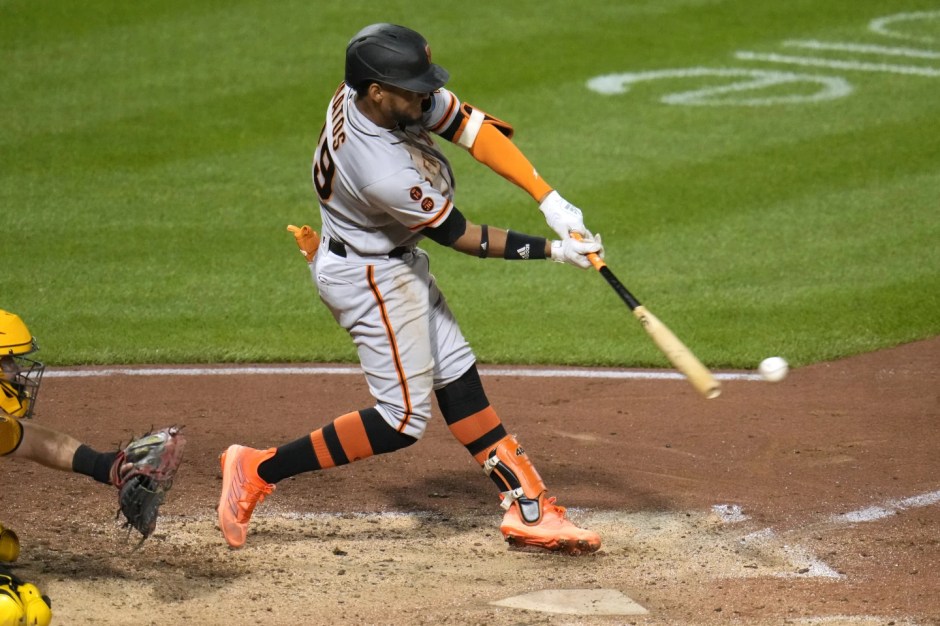 San Francisco Giants Luis Matos slugs an RBI off Pittsburgh Pirates pitcher Ryan Borucki in the top of the seventh inning at PNC Park in Pittsburgh on Fri Jul 14, 2023 (AP News photo)