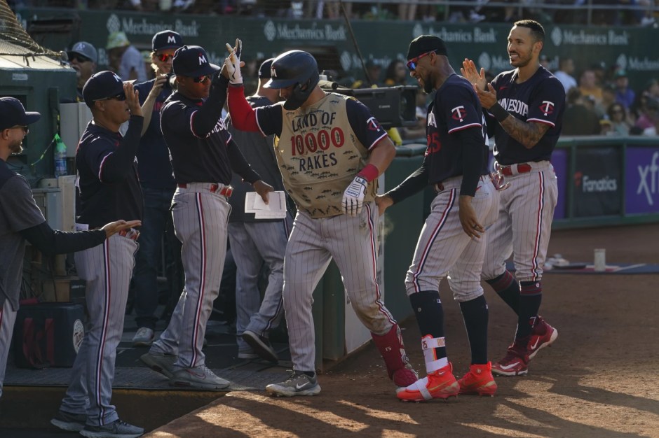 Kyle Farmer of the Minnesota Twins gets the Land of 10,000 Rakes sack jersey after clouting a top of the seventh home run against the Oakland A’s at the Oakland Coliseum on Sun Jul 15, 2023 (AP News photo)