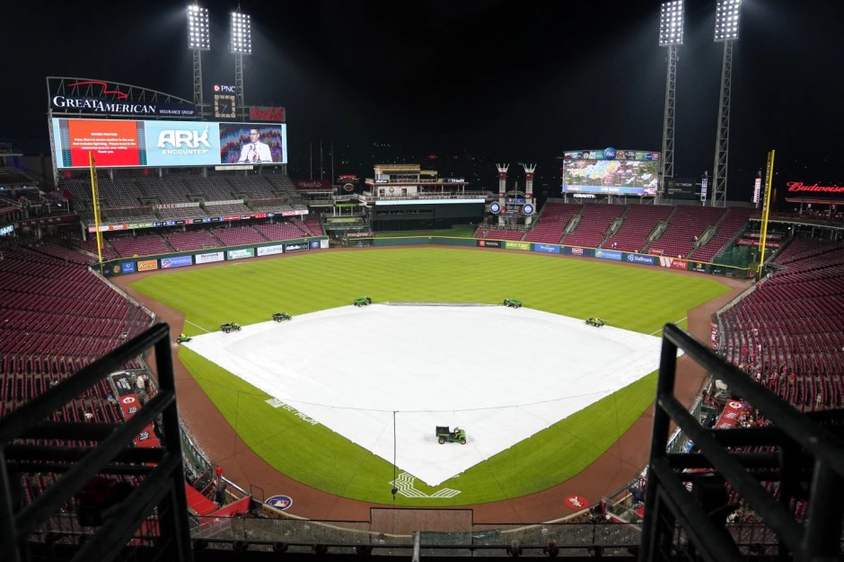 The field was covered after an 1 hr 55 min rain delay and suspended on Mon Jul 17, 2023 between the San Francisco Giants and Cincinnati Reds. The contest will continue Tue Jul 18, 2023 at Great American Ballpark in Cincinnati (AP News photo)