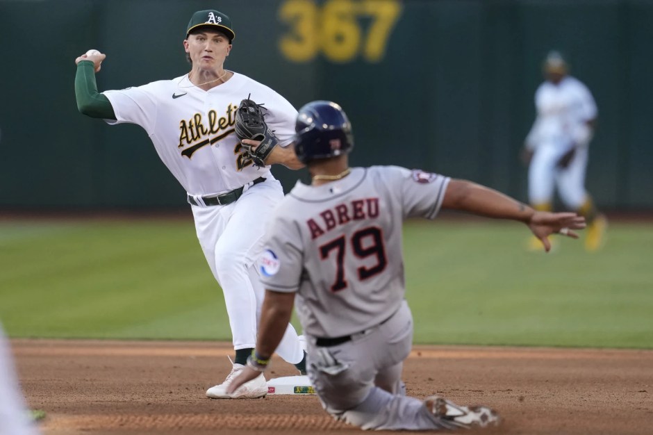 Oakland A’s second baseman Zack Gelof gets the force on the Houston Astros runner Jose Abreau (79) but Gelof makes a throwing error to first in the top of the fourth inning. Gelof made up for it later breaking up Astros pitcher Cristian Javier’s no hitter in the sixth inning and getting his first MLB home run in the seventh inning at the Oakland Coliseum on Sat Jul 22, 2023 (AP News photo)