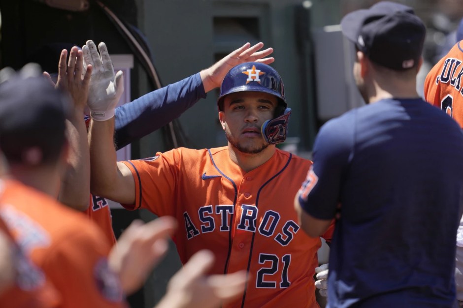 Houston Astros’ Yainer Diaz (21) is congratulated by teammates after hitting a home run against the Oakland Athletics during the fifth inning at the Oakland Coliseum on Sun Jul 23, 2023 (AP News photo)
